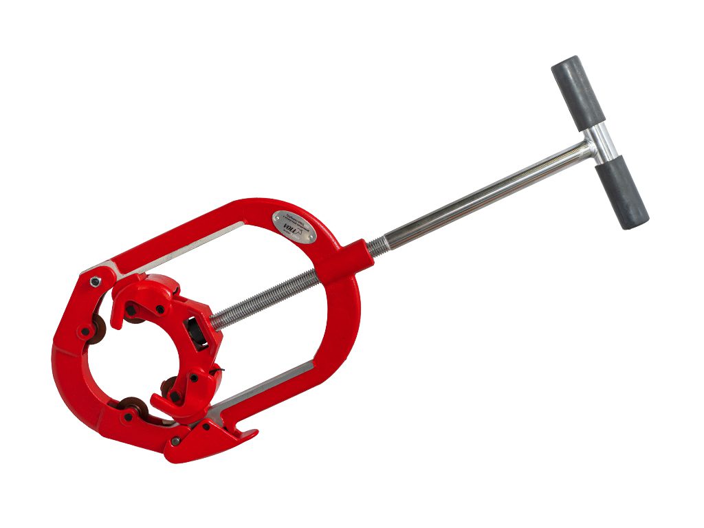 Труборез VOLL V8S с хомутной защелкой предназначен для резки стальных труб диаметром от 6″ до 8″ дюймов.